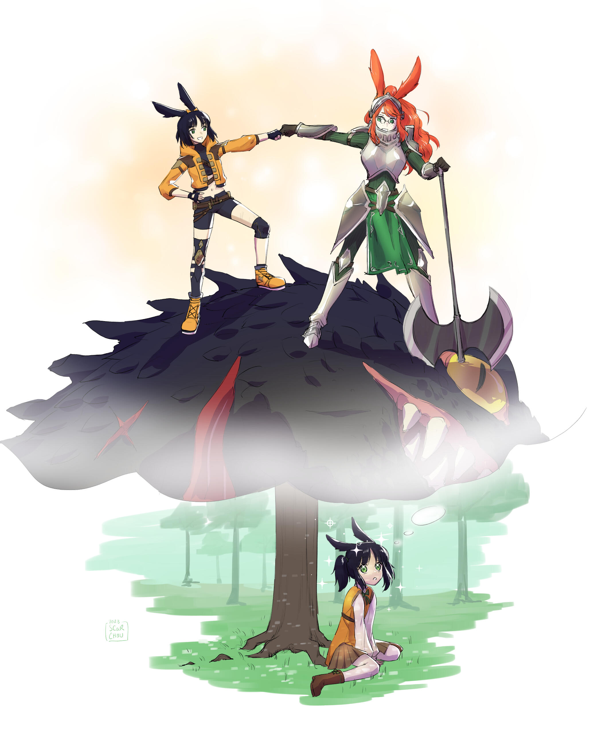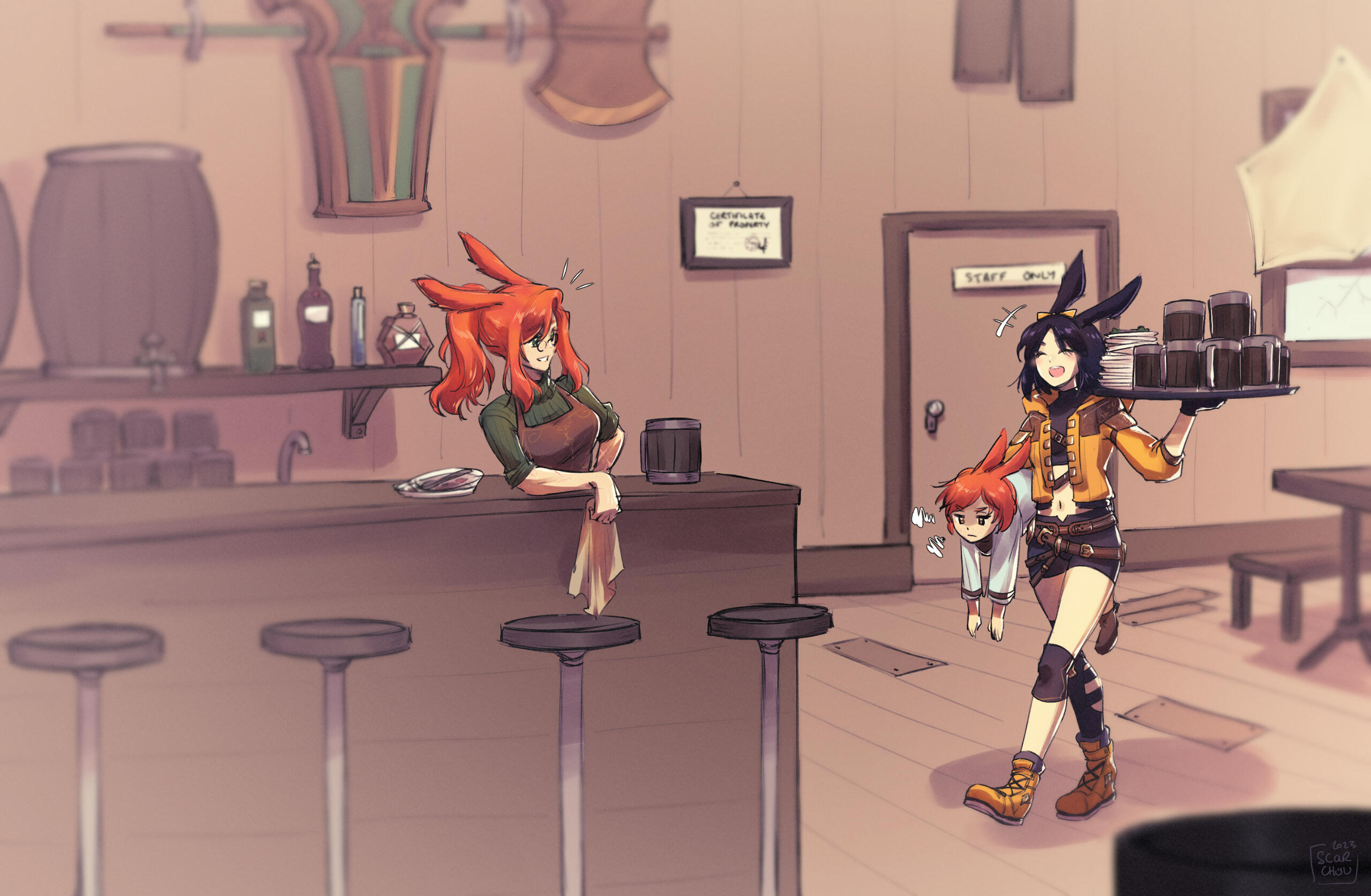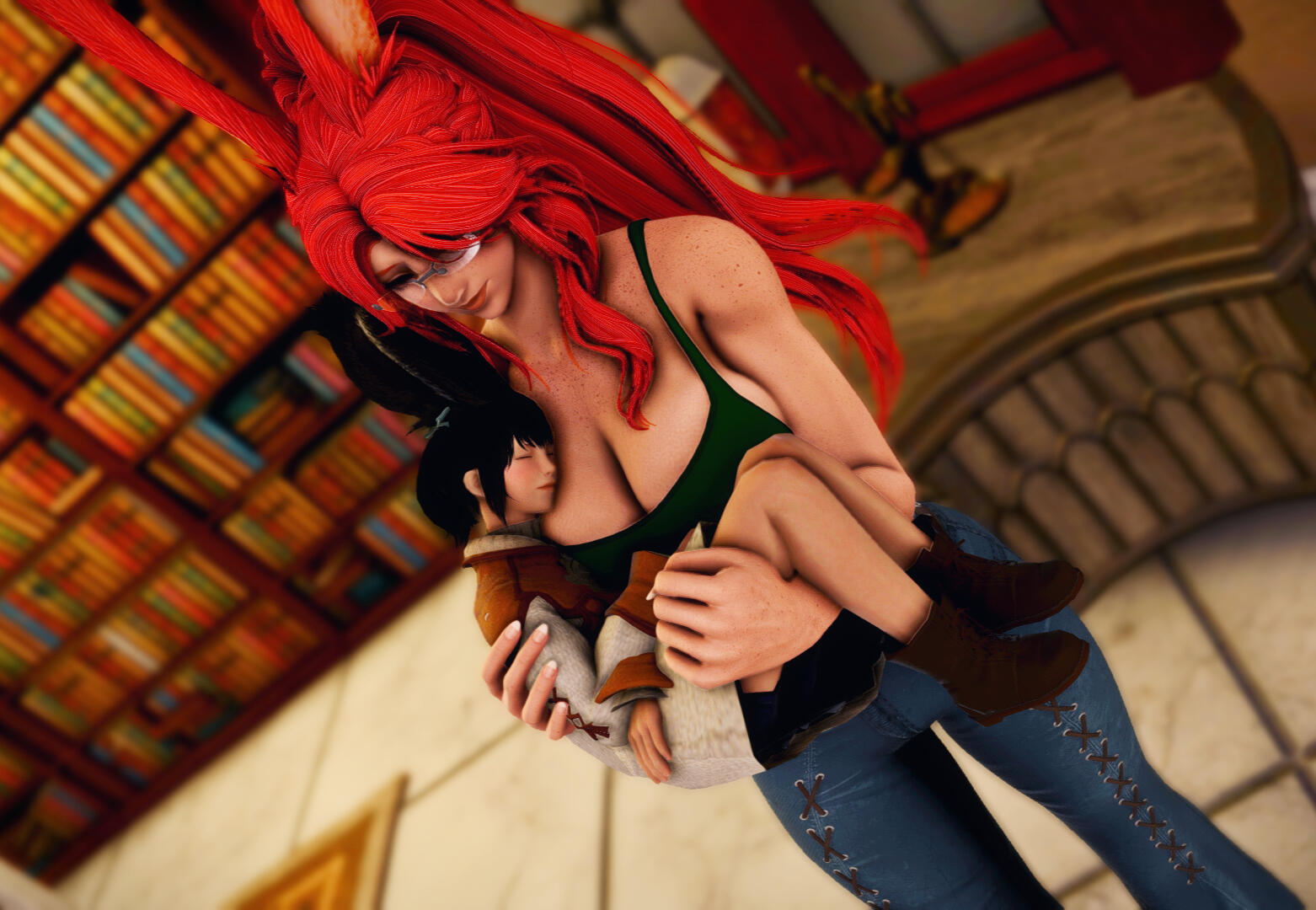 Being treated as human beings once more (or the first time for Lin) was a destabilizing experience for mother and kit. It took weeks for Hypa to accept the idea there wasn't any deception involved, only genuine benevolence. Her daughter however happily discovered the simpler, and much merrier existence I child could pretend to... In turn helping her mother to gradually warm up. Gridania was far from what she knew of a city, and with very different culture than her own. Still, despite some glances at her unusual features, she found the people pretty comprehensive, thanks to Eleux. Using his relations once more when she started to voice the need to cover her and Lin's need by herself, he introduced Hypa to the local adventurer guild. Here, the redhead's obvious martial skills and the absurd strength she shown earned her a trial as rescue and recovery team for the many young adventurers the guild trains.Despite critics for her lack of sociability and teamwork, her initial commendable results assured her a full-time job. Enough for her to finally rent a small apartment, and taking care of Lin as a true parent. Alas, it came to the price of being separated from each other the day if not longer on peculiar mission. Lin struggled to accept that at first, and secretly it was all the same for Hypatia. Still, the child's growing curiosity for school where all her playing buddies intended helped. And soon, the lil' viera proudly made her debut in classrooms.Hypatia gradually became more sociable to her colleagues, especially with Mioune actively making sure of that. With more and more sprouts rescued by her, she also started to earn small reputation of a protective figure. A strange, but welcomed rekindling with her nature... At long last she could see herself getting used to this tiring, but peaceful lifestyle of a single mother. Even if she was yet to celebrate her nameday making her fully adult for the local law.