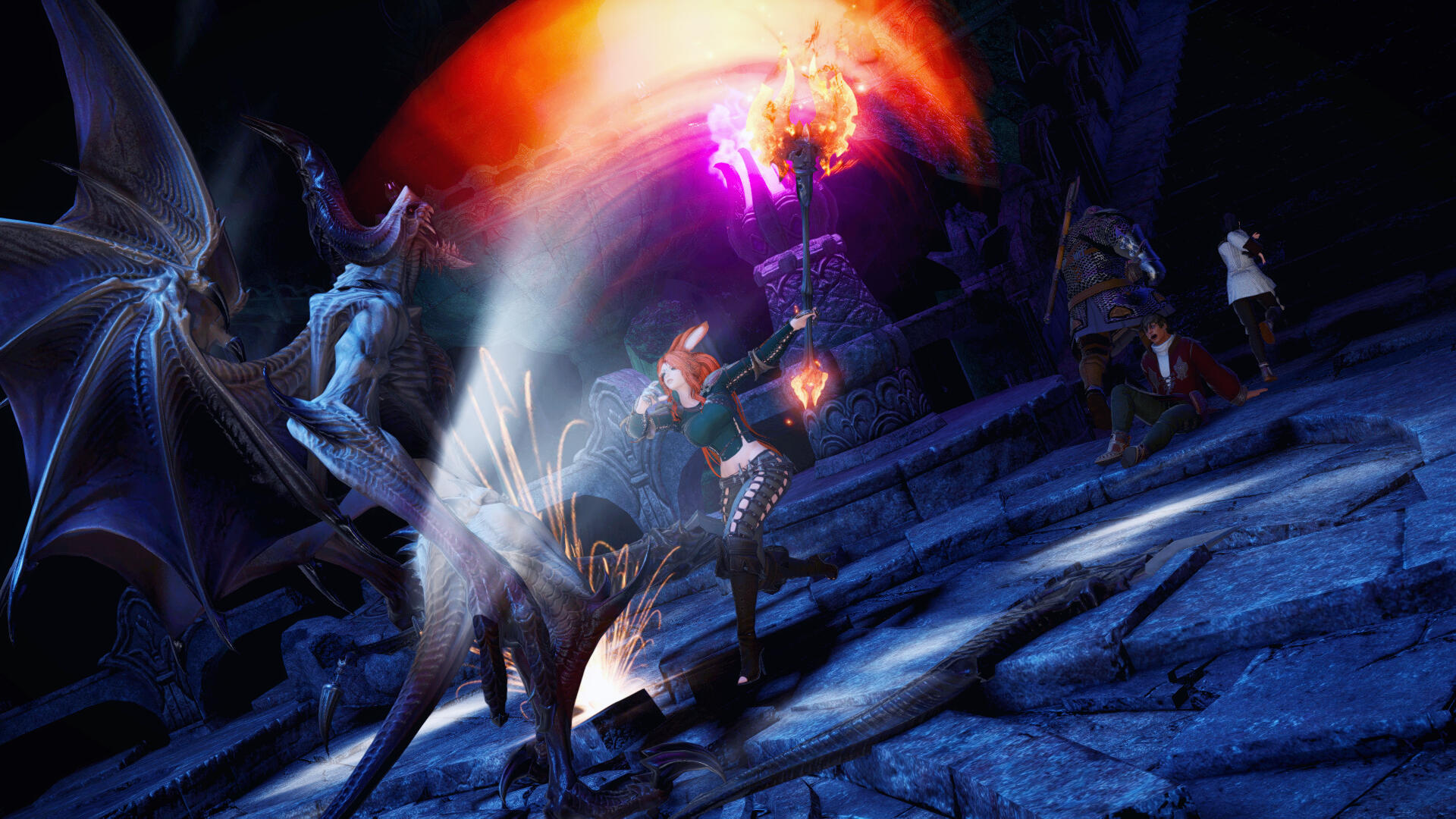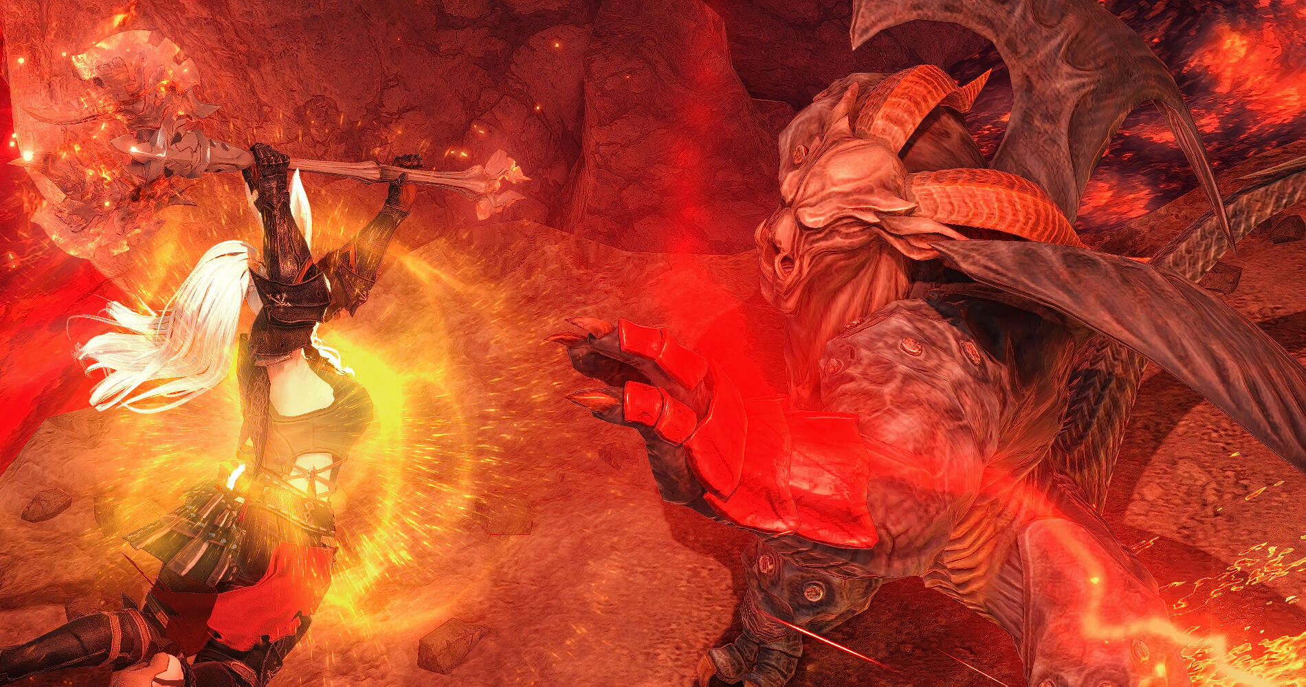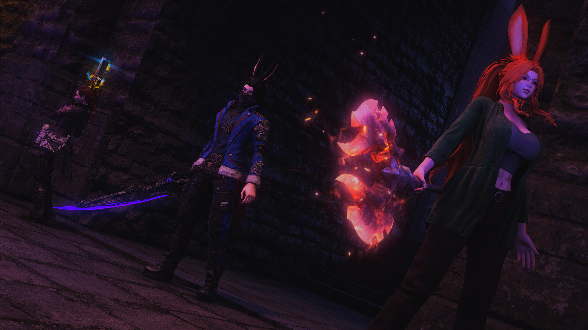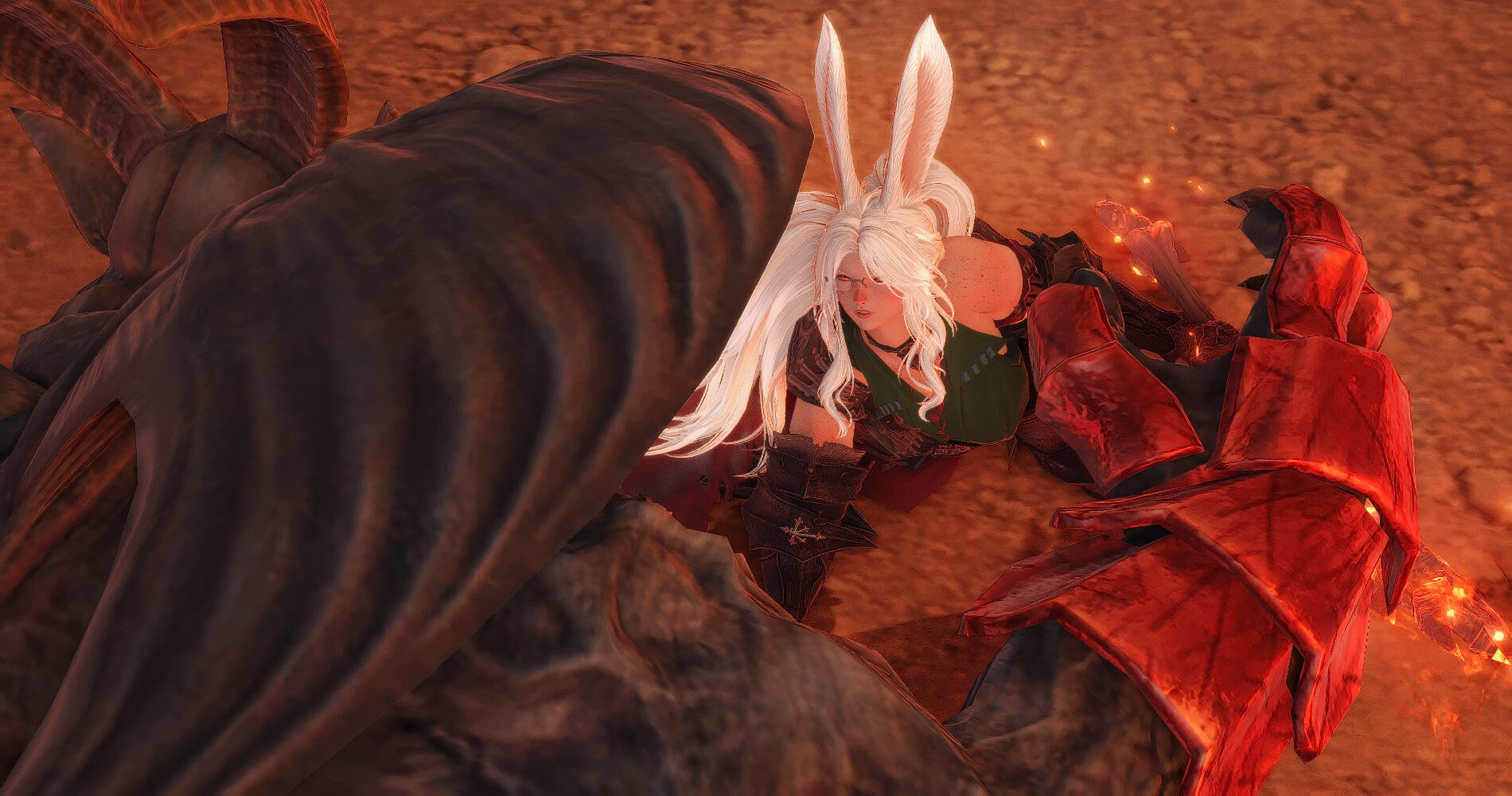 It was a gig sounding like any other when she took this of the clan job board. Strange noises, couple scavengers missing after venturing in one of Rabanastre's many ruined districts. Probably some rogue magiteck warmachine thought the redhead, an easy job. Rarely she mistaken so badly.Her investigation lead her near a collapsed villa, nothing much left aside damaged staircase to the cellar. There, she couldn't miss the huge hole opening on a more natural cavity. Be it misplaced confidence or certain tiredness, her lack of caution was heavily paid. The second she entered the cave, a massive blow send the warrior flying. Ribs most certainly broken, she rose with difficulty to see what struck her. A fleeting second saw her doubt her own sanity, for the beast depiction was, until now, only belonging to legends.This fiend was yet far too real, rushing against for blood with a swiftness uncanny for a body this size. Drunk with pain and adrenaline, the viera didn't hesitated to tap in her cursed ability, regardless of its consequence : this fight was of predator and prey, and this time she felt on the loosing side.