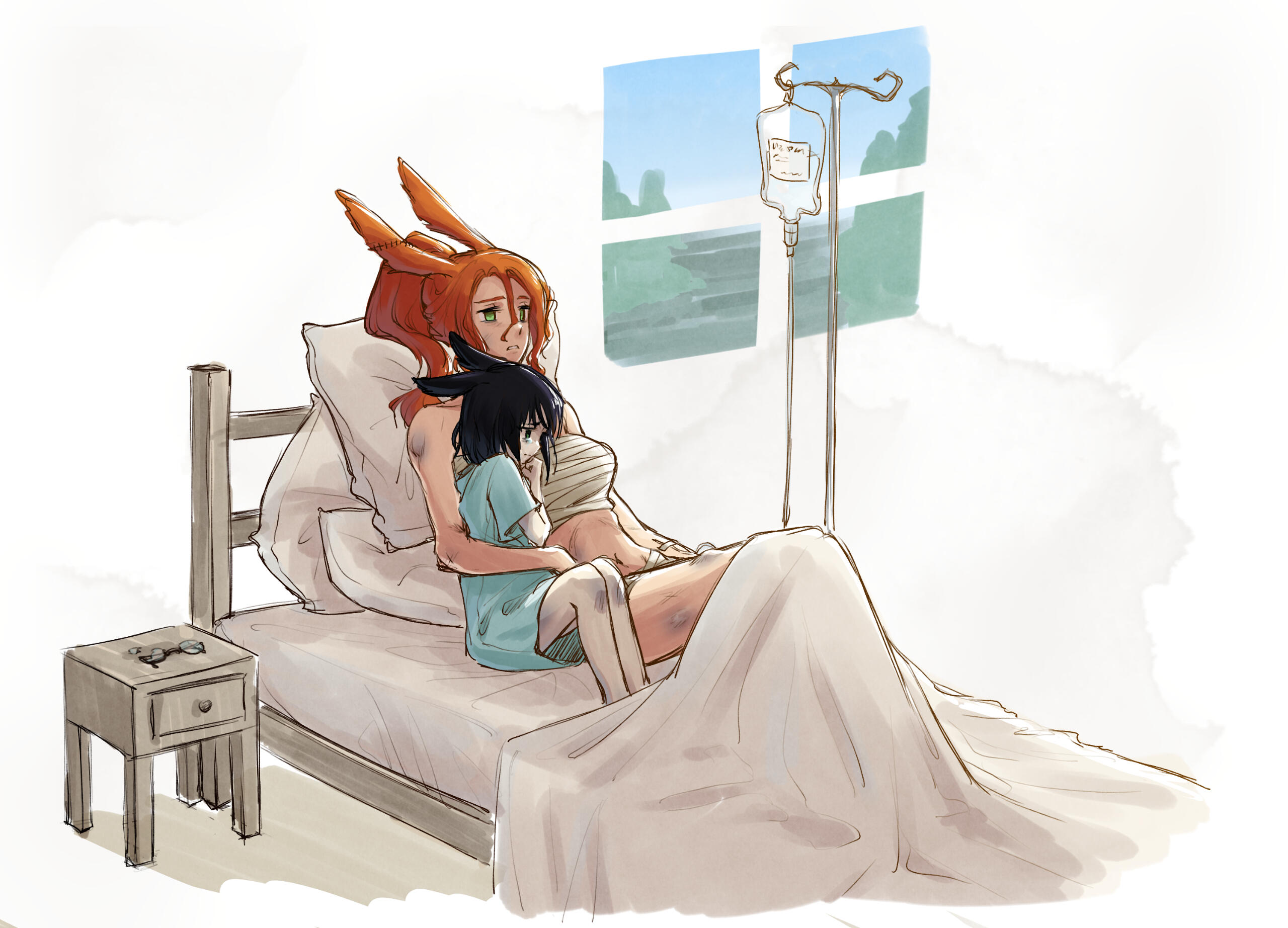 What was supposed to be an pretty mundane supply convoy disruption turned into a nightmare. Most likely from an inside job, the resistance was expected by armoured infantry from the XIIth legion reinforcements. The battle turned into a slaughter, Hypatia fighting valiantly, even taking of a magiteck armor by herself. Seeing her close comrades bathing in their blood made her succumb to frenzy, especially since one was intimate enough to share his couch with her time to time. All focused fending off hated foes, she failed to retreat from the opening made by her mother. Erin could only watch with pained rage her only daughter encircled and brought down.But the fate awaiting Hypatia was worst than death. She awoken with few other prisoners on an airship, tied but patched up, and barely covered. The only thing she could grasp when pushed out of the landed ship like cattle is the landscape. She wasn't in Dalmasca anymore, those mountain of pinkish rocks unknown to her.Inside the cold facility of black steel and tunnels, she was forced to humiliating examination, be it from people in lab coats or passing through ominous machines. She couldn't understand the language of her enemies, but knew they found some interest in her by how they put her aside the rest. Then a pureblood third-eyed man came, looking at her like she would for an ant... Only his hyur assistant spoke her few words in eorzean "You're now Beta01"A chill on her spine from her humanity denied, but soon replaced by scorching hatred for her jailers when thrown in a white cell with reinforced doors. She wasn't alone inside. A shivering form curled into a corner, scared and miserable, so tiny... A kit of her tribe, jet-black hair and jade eyed. A toddler of barely few years, treated with the consideration for a lab rat. Beta02 was inscribed on the nameless child's collar. She didn't think twice. Unable to speak in front of the horror, Hypatia slowly approached the child to take it in her arms, so little and vulnerable thing... By the simple contact of the desperate kit trying to hide in this embrace, she knew she /had/ to protect it. Her.But this vow would prove hard to keep, the two separated from each other several times a day for experiments. Physical and medical tests, often painful, were only premises of something darker, she could feel it. She was alas proved true when the two of them were brought to a large room with other prisoners, in front of a gigantic device covered in ominous sarcophagus-looking pods. All unfortunate souls brought here were crammed in under her increasingly scared gaze... The the two were finally push at the structure's topmost resonating with pleas and weepings. Attached by force but still in view of each other... The world became only blinding light and excruciating pain as a burning /something/ was poured into their being in a deafening concert of dying screams.Both awoken in their cell, with only bleak hard biscuits as only comfort. Pain lingered, like molten lava running though her veins. The kit she named Lin after her lost comrade Linkuen was crying in pain, nothing she could help... But their torments only got worst as days and months went, the very notion of time fading in the cell cut from the outside world. They were turned into /things/, monsters for the hated enemy to experiment on. She became stronger, way stronger, with the growing fear to crush Lin in her arms. But also recovering fast from the beating and mistreatment called experiments......And mutilation. Her ear was cut, her arm severed without any sedation then reattached, stabbed, burnt... Her only glimpse of comfort was Lin escaping this kind of torture. The alteration she suffered was different, with the surprise of increasing her intelligence; soon she managed to talk to "Mama", then their jailers... But did little to improve their condition. At least she got names, those of Hypa sworn to kill one day. The cold woman overseeing their suffering was Ariadne lux Livana, working under Aulus mal Asina. From what the increasingly smart kit could tell Hypa, they wanted to give power to the magic-less third eyed people, and make both of them powerful enough to kill the person keeping countering the Empire's plans. They were made weapons. Hypatia couldn't give up to despair, especially with the kit increasingly behaving like being her own. Since the first time they were put in the hellish machine, she could feel increasingly tied to her by a connection she couldn't put words on it. Affection, however, was genuine. Deep inside, she knew she needed the child as much she needed her.